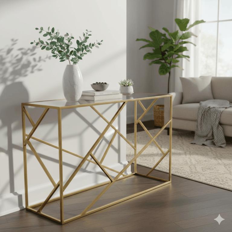 Consola Dorada Con Cubierta De Vidrio Y Diseño Geométrico