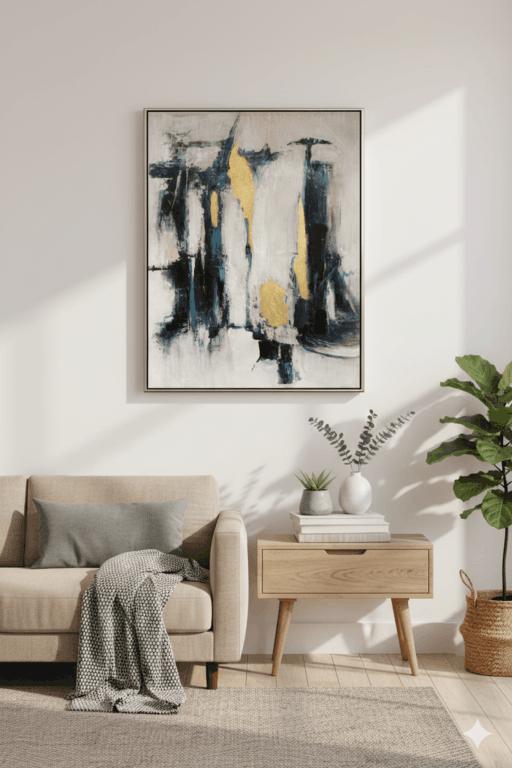 Cuadro abstracto gris con acentos dorados contemporáneo