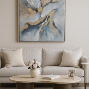 Cuadro abstracto tonos azules y grises con detalles dorados