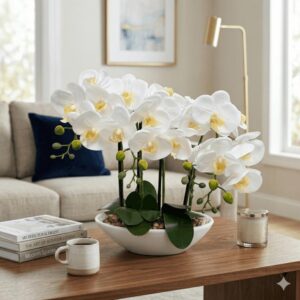 Arreglo de orquídeas artificiales blancas en base de cerámica