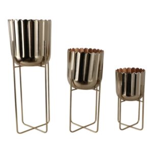 Meta descripción: Set de maceteros metálicos dorados con diseño acanalado. Elegancia y estilo moderno para tu hogar.