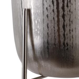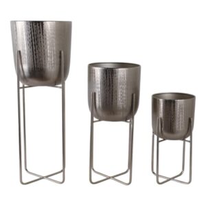 Set de tres maceteros metálicos en acabado plateado martillado con bases altas delgadas. Su diseño moderno y versátil los hace ideales para interiores elegantes.