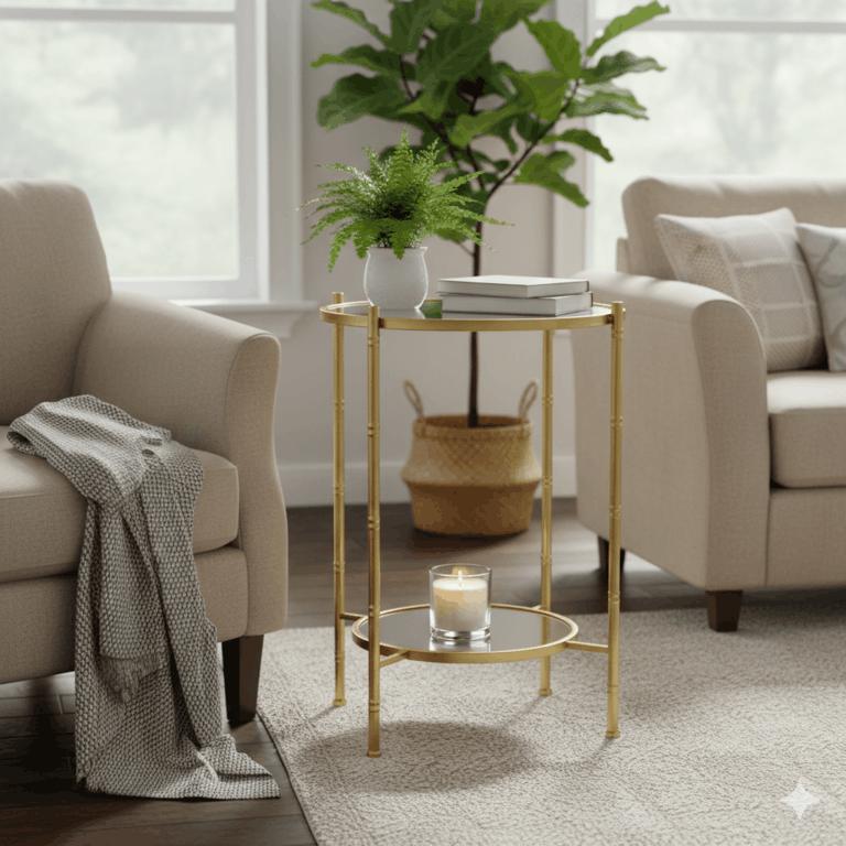 Mesa Auxiliar Redonda Dorada Con Doble Nivel Y Espejo