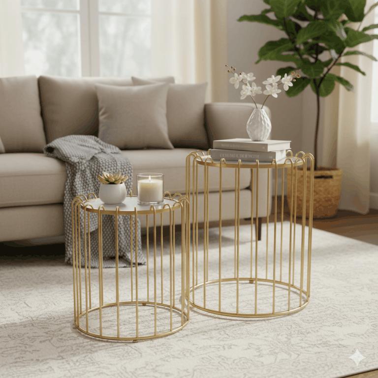 Mesas Auxiliares Redondas Doradas Tipo Jaula Con Espejo Set De 2