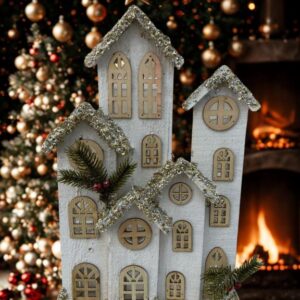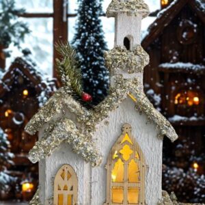 Iglesia navideña blanca con torre y luz LED