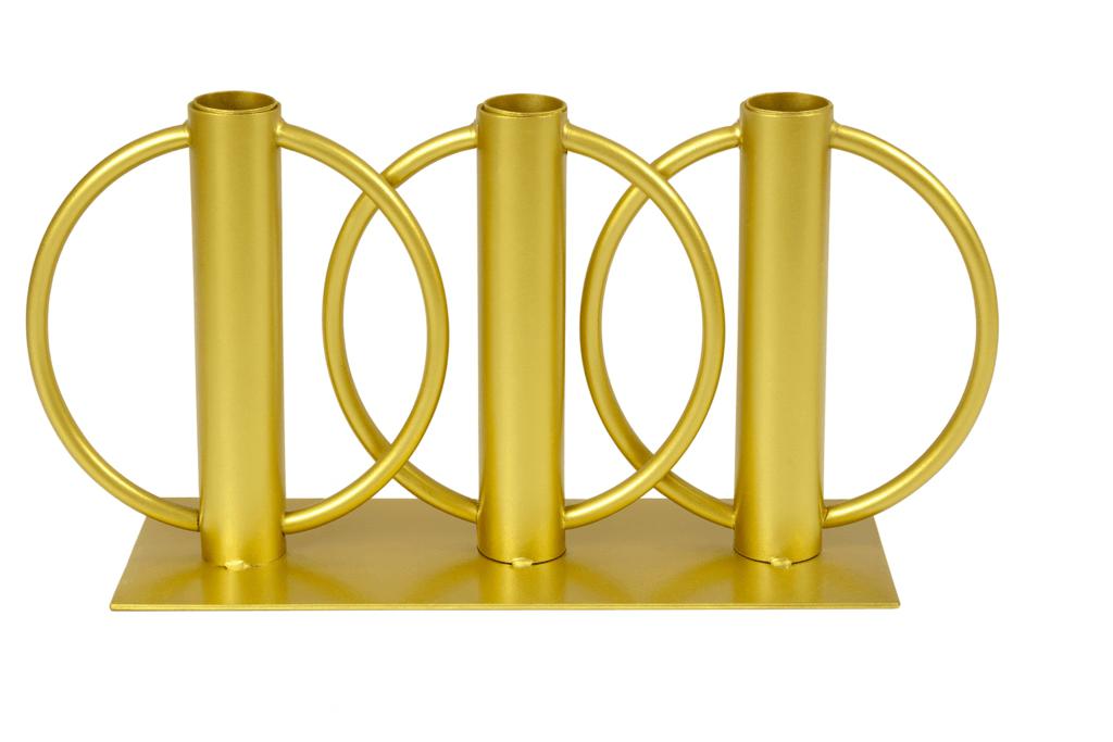 Candelabro decorativo moderno elaborado en metal dorado, con estructura compuesta por tres tubos cilíndricos unidos por aros circulares. Su diseño geométrico aporta equilibrio visual y un toque artístico contemporáneo.