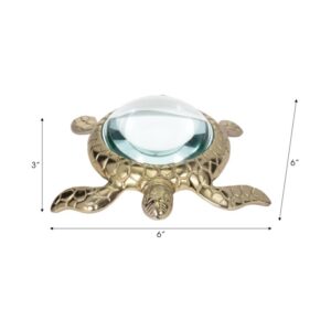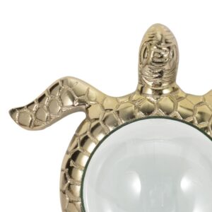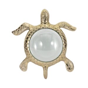 Figura decorativa de tortuga fabricada en latón dorado con lente de aumento de vidrio en el caparazón. Funcional y estética a la vez.