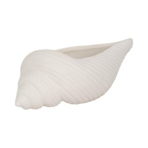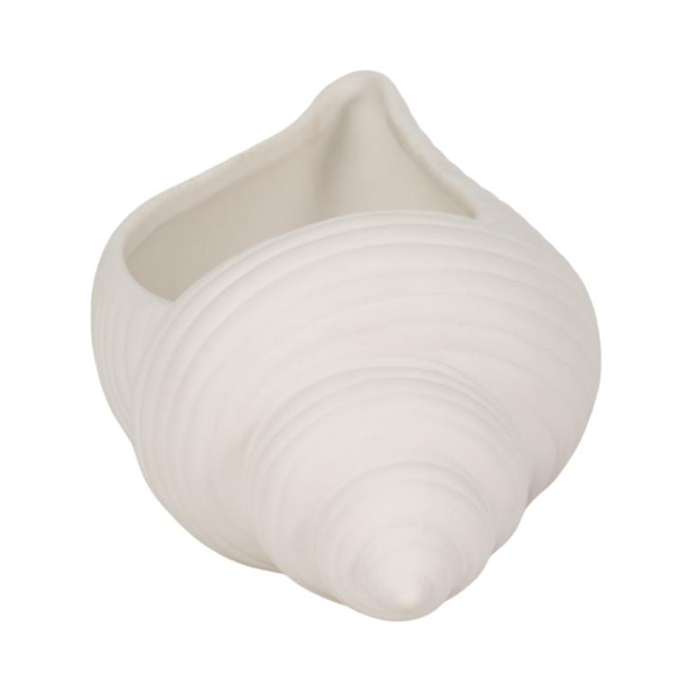 Macetero decorativo con diseño de caracol marino, acabado en blanco mate con textura de líneas. Una pieza original para acentos marinos y modernos.
