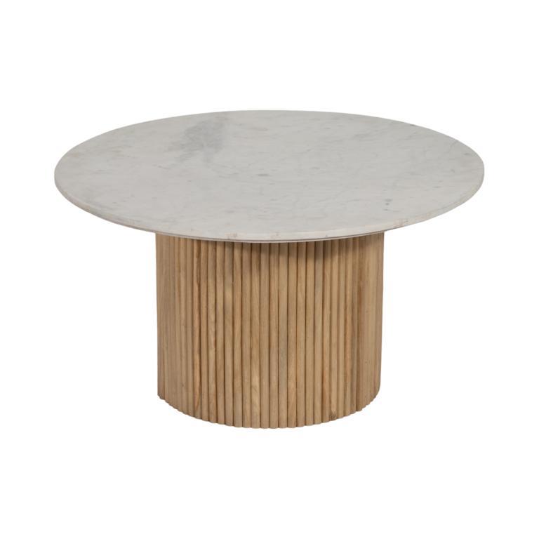 Mesa de centro con base cilíndrica de madera en diseño estriado vertical y cubierta de mármol blanco. Un diseño elegante que combina naturalidad y sofisticación.