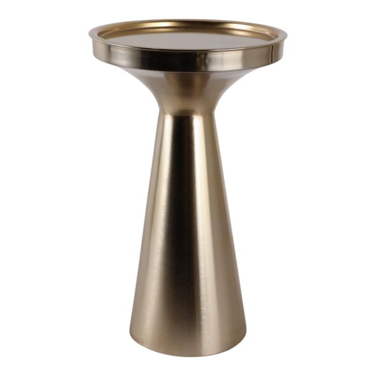 Mesa auxiliar redonda con cubierta metálica lisa y estructura cónica en acabado dorado pulido. Diseño minimalista y sofisticado.