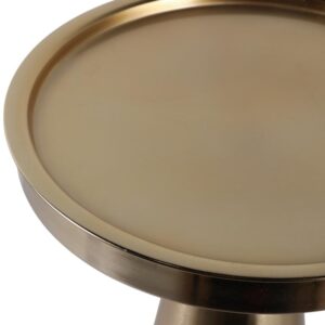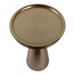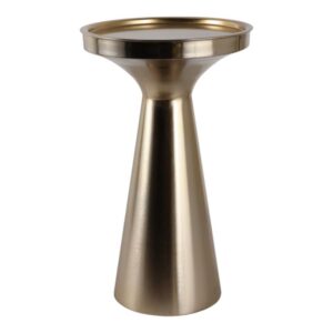 Mesa auxiliar redonda con cubierta metálica lisa y estructura cónica en acabado dorado pulido. Diseño minimalista y sofisticado.