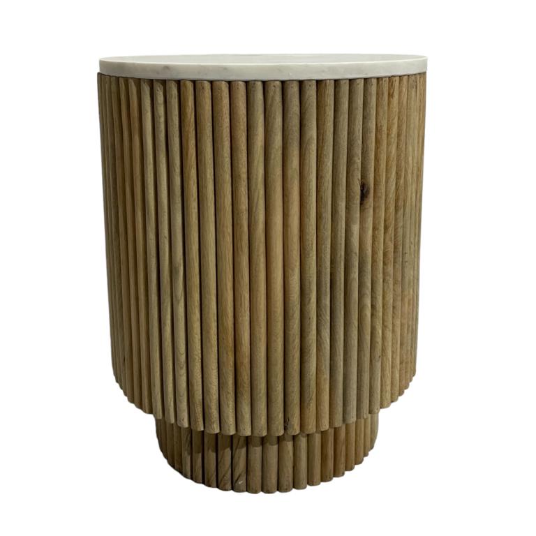 Mesa lateral cilíndrica con estructura de madera en acabado natural y cubierta circular de mármol blanco. Diseño elegante y atemporal. Sugerencias de uso Ideal para salas, recámaras o áreas de lectura como mesa auxiliar. Estilo de decoración Escandinavo, moderno natural y contemporáneo. Combinación con otros estilos Combina con muebles de madera clara, tapicería neutra y detalles metálicos dorados. Material: Madera y mármol Meta descripción: Mesa lateral redonda de madera con cubierta de mármol blanco. Estilo elegante y natural para salas y recámaras.