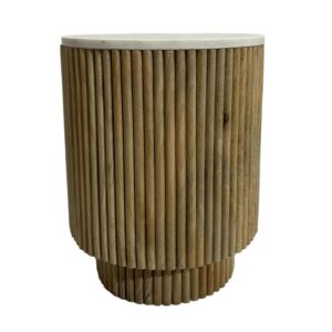 Mesa lateral cilíndrica con estructura de madera en acabado natural y cubierta circular de mármol blanco. Diseño elegante y atemporal.