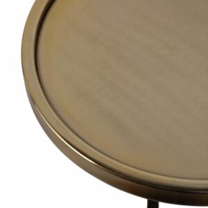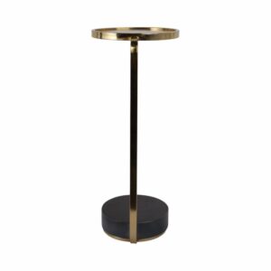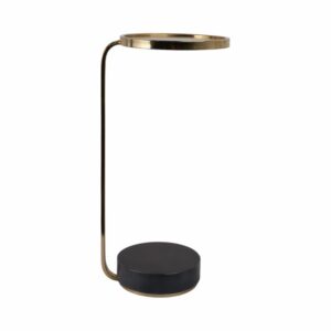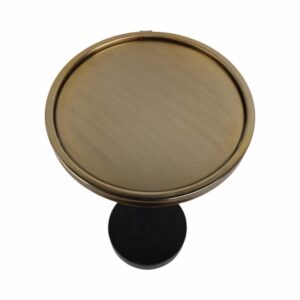 Mesa lateral con base metálica en color negro y detalles dorados. La cubierta redonda con borde dorado aporta un contraste elegante y moderno.