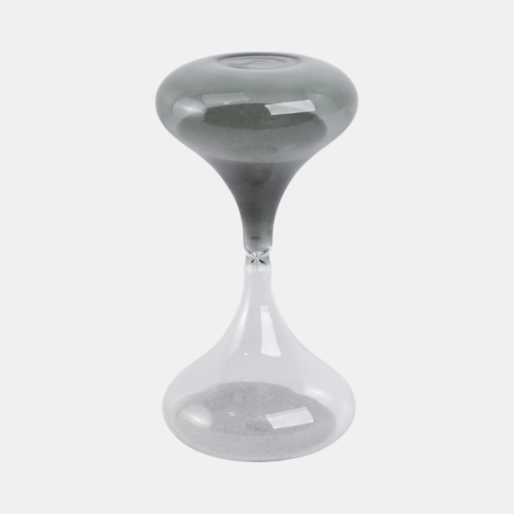 Reloj de arena fabricado en vidrio transparente con parte superior en tono gris. Diseño elegante y funcional que combina decoración y utilidad.